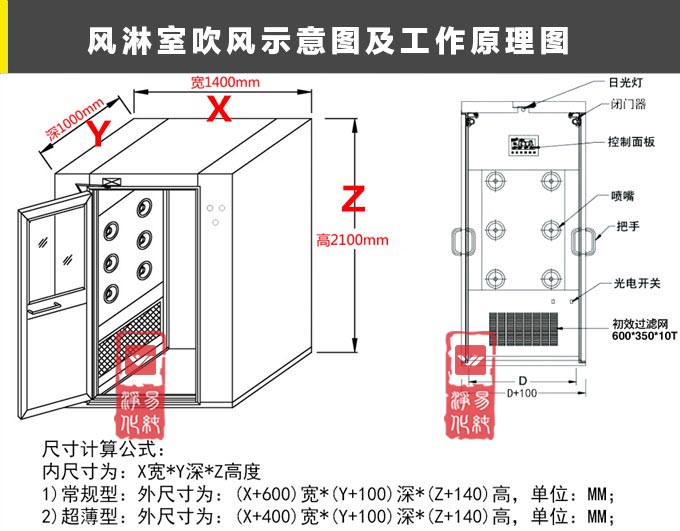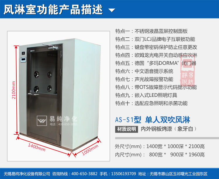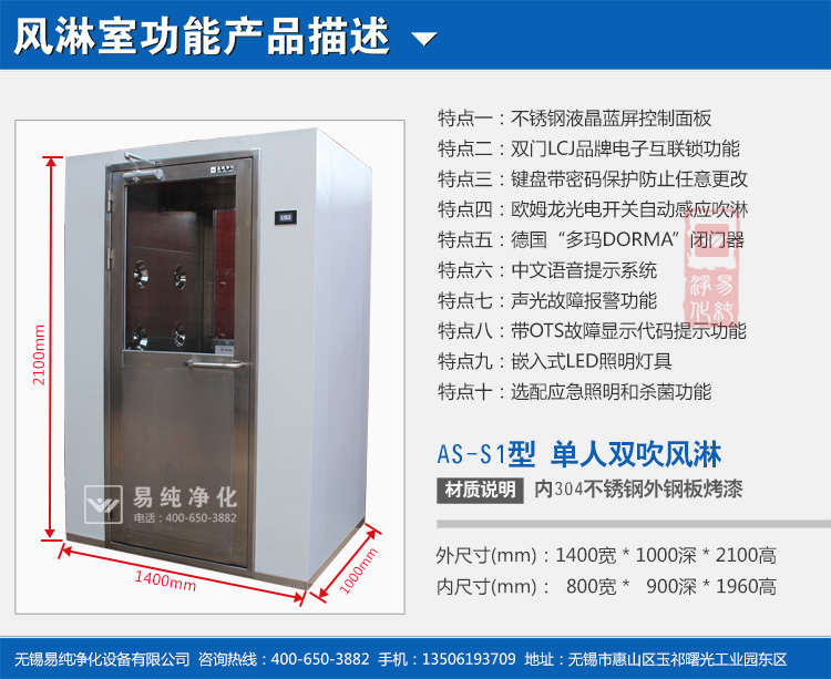 1. 外型尺寸(W*D*H):1400mm*1000mm*2100mm;風淋區尺寸(W*D*H):800mm*900mm*1960mm